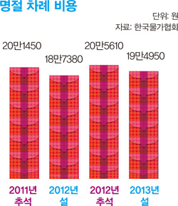 설 명절이 성큼 다가왔다. 반갑다면 청춘이요, 근심이라면 주부(가장)라. 애매하다면, 혼기 꽉 찬 미혼? 설이 달갑지만은 않은 주부들의 고민은 역시 돈 때문이다. 한국물가협회가 1월23일 발표한 올해 설 명절 차례 비용은 19만4950원이다. 태풍 피해가 컸던 지난해 추석보다는 비용이 줄었지만 직전 설보다는 늘었다. 어쨌거나 20만원 남짓으로 평범한 차례상을 차릴 수 있다는 건 ‘망상’에 가깝다. 일단 통계는 4인 가구 기준이라 형님·아우 가족만 단출하게 모여도 비용은 배로 뛴다. 결정적으로 최소한의 제수음식 기준인 탓에 그 맛있는 잡채는 꿈도 못 꾼다. 이렇게 장바구니 물가와는 거리가 먼 공허한 수치가 오히려 화만 돋운다는 게 주부들의 하소연이다. 그나저나 MB가 가면 장바구니 물가 잡는다며 만든 ‘MB 물가지수’는 어떡하지? 헉 죄송, 우리 주부님들 또 화나실라.