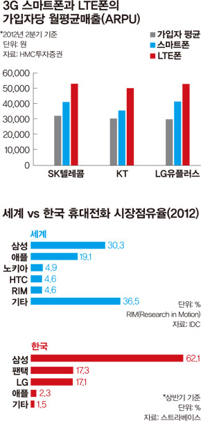 이리저리 머리 굴려 최신 휴대전화를 저렴하게 산다고 해서 호갱님 생활이 끝나는 것은 아니다. 설 연휴 동안 서울 시내 매장 서너 곳을 돌아본 기자는 LTE 요금을 신청해야 휴대전화를 살 수 있다는 답을 들어야 했다. LTE폰밖에 제품이 없다는 것이었다. 물론 LTE를 이용하려는 소비자도 있을 것이다. 그러나 LTE 시장을 만든 것이 다수 소비자들의 욕구였을까? LTE 가입자들은 3G 스마트폰 가입자보다 월 평균 1만원가량 요금을 더 내고 있다. 이통사 처지에서는 더 많은 매출을 거둘 수 있는 새로운 시장인 셈이다. 그렇기에 LTE폰에 판매장려금을 많이 붙여 판매점으로 하여금 적극적인 유통에 나서게 하고, 소비자도 최신폰을 싸게 살 수 있는 기회를 외면하지 못하고 LTE로 갈아타는 경우가 많다.