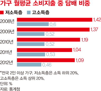 담뱃값을 2500원에서 4500원으로 올리는 방안이 추진되고 있다. 국민 건강을 위해서란다. 그러나 담뱃값이 뛰어도 모든 흡연자가 똑같이 영향을 받는 건 아니었다. 통계청에 따르면, 저소득층 가구는 지난해 월평균 소비지출 125만원 가운데 1.09%인 1만3천원을 담뱃값으로 썼다. 같은 기간 고소득층의 담배 지출 비중은 0.46%(월평균 1만7천원)에 그쳤다. 저소득층 흡연자가 고소득층보다 담뱃값 부담을 두 배 이상 많이 느낀다는 의미다. 아무리 담뱃값 인상을 건강 관리에 취약한 저소득층 흡연자를 위한 특별 조처라고 생각하려 해도, 현재 연간 담배 조세 수입(7조3천억원) 중 전체 흡연자를 위해 들어가는 돈(300억원)은 쥐꼬리만 하다. 세수입을 늘리려고 저소득층 흡연자의 주머니를 턴다는 음모론이 제기되는 이유다. 아, 담배 당겨.