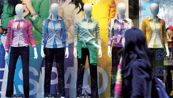 옷에 대한 인간의 욕망은 무궁무진하게 계속 불어나고 있으며, 의류시장은 절대적 포화 상태에 아직 이르지 못했다. 서울 명동의 한 옷가게 앞에서 겨울옷을 입은 여성이 진열된 봄옷을 보고 있다. 한겨레 김명진 기자