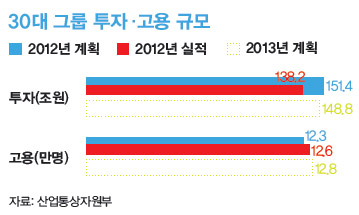 대기업은 ‘통’이 컸다. 30대 그룹 사장단은 지난 4월4일 윤상직 산업통상자원부 장관과의 간담회에서 올해 148조8천억원을 투자하겠다고 발표했다. 지난해 투자액(138조2천억원)보다 7.7% 늘어난 규모다. 신규 인력은 지난해(12만6천 명)와 비슷하게 12만8천 명을 채용하기로 했다. 대기업들은 ‘책임 있게 계획을 집행하겠노라’고 약속하면서 정부에 규제 완화와 세제·금융·인력 지원 확대를 깨알같이 건의했다. 그러나 30대 그룹에는 지난해 이맘때쯤 151조4천억원 투자 계획을 발표하고선 실제 투자액은 경기침체 등을 이유로 13조원이나 줄인 전력이 있다. 올해는 대기업이 통 큰 약속을 통 크게 지키려나.