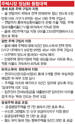 ‘4·1 부동산 대책’에 백화점식으로 나열된 46가지 세부 대책은 대부분 목표가 하나다. 아직 집을 살 만한 구매자를 찾아내 구매 심리를 자극하는 일이 그것이다. 정부가 가장 공들인 집단은 ‘생애 최초 주택 구매자’다. 이례적인 혜택이 줄줄이 내걸렸다. 생애 최초 주택 구매자(부부 합산 연소득 6천만원 이하)가 올해 안에 6억원 이하ㆍ85㎡ 이하 주택을 사면 취득세를 한 푼도 내지 않아도 된다. 주택 구입 자금이 부족하면 연말까지는 은행의 재량으로 총부채상환비율(DTI)에 상관없이 빚을 낼 수도 있다. 주택담보대출비율(LTV)도 60%에서 70%로 완화된다. 일반 구매자들은 정부의 ‘빚 통제’ 때문에 꿈도 못 꾸는 일이다. 원리금 상환이 부담된다면 30년 동안 나눠 갚아도 된다. 한마디로 세금도 안 받고 빚도 쉽게 내줄 테니 올해 안에 집을 사라는 얘기다. 이미 하우스푸어로 전락해 집을 살 여유가 없는 중산층이나 돈 안 되는 집에 투자할 마음이 없는 상류층을 빼고 나면, 무주택자나 신혼부부 등이 꺼져가는 집값을 떠받쳐줄 수 있는 마지막 손님이기 때문이다. 정부가 터지기 직전인 ‘폭탄’을 소득·자산이 적은 계층에게 안기는 셈이다. 남기업 토지+자유연구소 소장은 “지금은 그동안 너무 높았던 집값이 정상화되는 과정이라 볼 수 있다. 인위적인 부양책으로 반짝 집값이 오르거나 유지될 수 있어도 얼마 못 가 다시 하향 곡선을 그릴 것이다. 그렇게 되면 덜컥 빚을 내 집을 산 생애 최초 구매자들은 또 다른 하우스푸어로 전락할 가능성이 높다”고 비판했다.