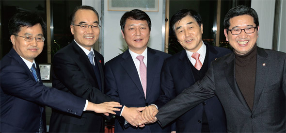 박근혜 정부는 이명박 정부가 올해 예산안을 마련하며 세입을 과다하게 계산한 탓에 실제로는 12조원의 세수가 덜 걷힐 것으로 우려된다며 추가경정예산 편성을 추진하고 있다. 박재완 당시 기획재정부 장관(왼쪽 둘째)과 장윤석 국회 예산결산특별위원회 위원장(오른쪽 둘째) 등 정부 고위 관료와 여야 의원이 지난해 12월31일 ‘2013년 예산안’에 합의한 뒤 손을 잡고 있다. 한겨레 이정우 기자
