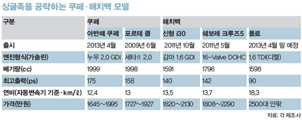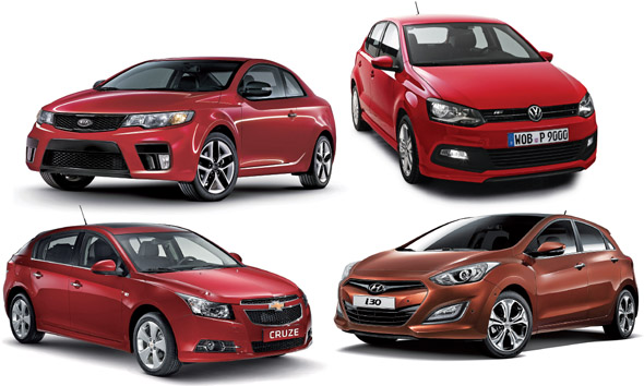 국내외 완성차 업체들이 스타일·주행성능·실용성을 골고루 원하는 싱글족들을 겨냥해 쿠페와 해치백 모델을 선보이고 있다. 왼쪽 위 기아자동차의 포르테 쿱부터 시계방향으로 폴크스바겐의 폴로, 현대자동차 i30, 한국지엠의 쉐보레 크루즈5.