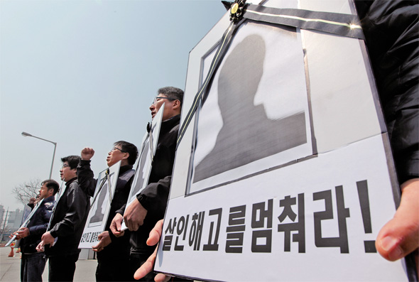 전국금속노동조합 쌍용자동차지부 조합원들과 해고자, 시민사회단체 회원들이 지난해 4월 경기도 평택 쌍용자동차 공장 앞에서 해고노동자들의 연이은 투신자살과 관련해 정부 대책을 요구하고 있다. 한겨레 신소영 기자