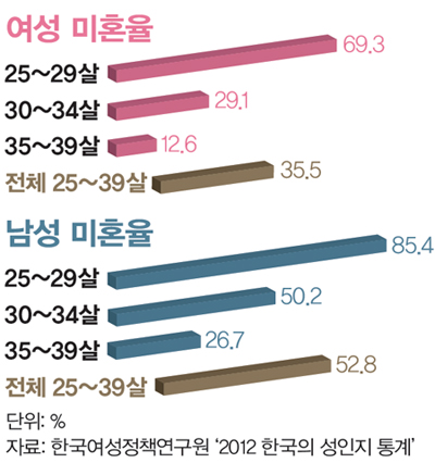 2004년 30살에 동갑내기 남편과 결혼할 때 우리는 늦은 것도 아니었지만 이른 것은 더더욱 아니었다. 유치원을 다니던 친구의 아들은 신부대기실에 찾아와 이렇게 걱정했다. “엄마, 이모는 아기 언제 낳아서 언제 키워?” 싸늘한 침묵이 일순간 내려앉았다. 하지만 지난 10년간 세상이 달라졌다. 아기를 낳지 않을뿐더러 결혼하지 않는 20~30대 남녀가 빠르게 늘고 있다. 한국여성정책연구원이 통계청과 각 부처의 통계를 분석해 펴낸 ‘2012 한국의 성인지 통계’ 보고서를 보면, 2010년 기준으로 25~39살 여성의 미혼율은 35.5%, 남성 미혼율은 52.8%로 집계됐다. 여성 미혼율은 2005년(27.4%)보다 8.1%포인트 올랐고, 10년 전(18.3%)과는 2배나 차이 난다. 남성 미혼율도 2005년과 2000년보다 각각 6.9%포인트, 16.5% 포인트 높아졌다.
