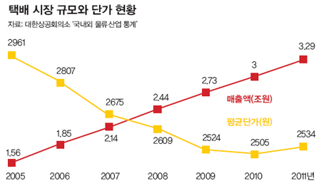 여기에 고질적인 택배산업의 낙후성도 한몫했다. 택배시장 매출은 2005년 1조5600억원에서 2011년 3조2900억원으로 증가했다. 하지만 택배 물건 1개당 단가는 같은 기간 2961원에서 2534원으로 떨어졌다. 택배 노동자가 받는 수수료도 800~900원대에서 좀체 늘지 않았고 유류비·통화비 등 부담만 커졌다. 경쟁이 치열해지면서 저가 수주가 만연해졌다. 지난해 말 중견 택배업체 이노지스가 부도난 것도 같은 이유라고 업계는 바라보고 있다. 이로 인해 택배 단가를 인상해야 한다는 주장이 많지만, 이를 실행에 옮긴 것은 현대로지스틱스가 유일하다. 한 택배업체 관계자는 “택배 물량의 절반 이상을 차지하는 온라인·홈쇼핑 업체에서 물류업체를 선정할 때 가격을 최우선으로 본다. 그러다보니 일감을 따내려는 택배사가 가격을 낮출 수밖에 없고, 그 부담이 택배 기사나 대리점으로 전가될 수밖에 없다”고 말했다.