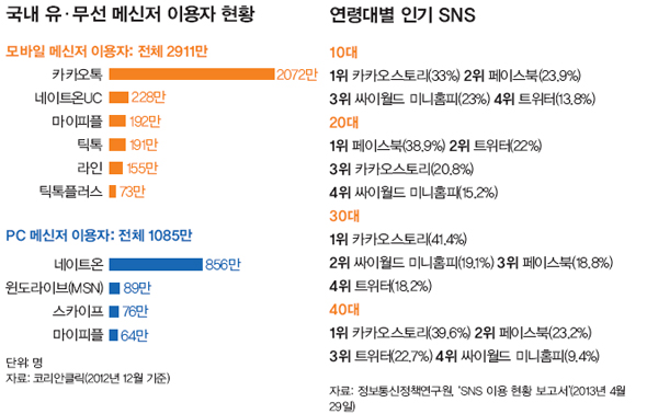 두 번째는 컴퓨터 이용 형태가 전반적으로 PC 환경보다 스마트폰·태블릿PC 등 모바일 환경으로 옮겨간다는 점이다. 메신저 프로그램 이용 인구 자체도 모바일 쪽이 훨씬 많다(표 참조). 모바일과의 접점을 찾지 못하면, 메신저 서비스는 살길을 찾기가 힘들어졌다. 이미 네이트온은 ‘네이트온UC’라는 모바일 서비스를 내놨고, PC·모바일 병용이 가능한 마이피플(다음), 라인(네이버) 등 신규 서비스도 나와 있다. 문제는 아무리 좋은 메신저 프로그램이라도, 주위에 쓰는 사람이 없으면 무용지물이 되고 마는 메신저 프로그램의 특성이다. 상대적으로 이용자 수가 적은 서비스들에는 장벽이다. 마이피플이 설치된 스마트폰 이용자들끼리만 마이피플을 쓸 수 있고, 라인이 설치된 스마트폰 이용자들끼리만 라인을 쓸 수 있기 때문이다. 하지만 국내 이용자 규모로 따지면 카카오톡(사진)은 타의 추종을 불허할 만큼 독보적이다. 심지어 ‘누구나 갖고 있는 앱’이란 인식이 있을 정도이기 때문에 친구를 찾기가 어렵지 않다. PC카톡이 정식 서비스를 시작하면, 비단 갈 곳 잃은 윈도라이브(MSN)메신저 이용자뿐 아니라 다른 서비스들도 위협할 거란 전망의 근거다.