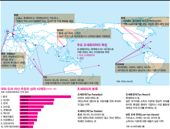 정작 조세회피처는 이처럼 큰돈을 벌고 있는 게 아니다. “조세회피처는 정거장에 불과할 뿐 거미줄 같은 국제 금융자본의 배후에는 영국 런던과 미국 뉴욕이 자리잡고 있다”고 <이코노미 인사이트>는 설명했다. 최대 32조달러로 추정되는 조세회피 자금이 국경을 넘나들 수 있는 이유는 돈이 컴퓨터에 존재하는 시대이기 때문이다. 예를 들어 국외투자 자금이 스위스 취리히에서 남태평양의 섬나라 바누아투와 케이맨제도를 거쳐 룩셈부르크로 흘러간다고 하면, 실질적으로는 런던·프랑크푸르트 혹은 취리히 금융가의 한 컴퓨터에서 비트와 바이트 몇 개만 달라질 뿐이다. 결국 조세회피처의 법인은 전 세계를 망라하는 금융 시스템의 주변부에 불과하다. 그 중심에는 막강한 국가와 은행, 세무 전문가, 변호사로 구성된 글로벌 대표 금융센터가 서 있다. 중심부가 없다면 당연히 무너질 수밖에 없는 구조다. 역외 지역 전문가 니컬러스 색슨은 독일시사지 <차이트>와의 인터뷰에서 “조세피난처라는 개념은 신중해야 한다”고 말했다. “사람들은 으레 카리브해의 조그만 섬나라나 기껏해야 스위스와 모나코 등을 떠올린다. 하지만 실제 많은 국가가 역외 서비스를 제공하고 있다. 빛의 속도로 국경을 자유자재로 옮겨다니는 대규모 금융자본을 유치하기 위해 혈안이 돼 있다.” 그런 의미에서 런던의 금융 중심지 ‘시티오브런던’(City of London)을 최대 규모의 ‘조세회피처’로 전문가들은 꼽는다. 미국은 아예 본토에 역외 체제가 있다. 1970년대부터 미국 은행들은 남미로부터 조세회피 자본을 유치해왔고 일부 연방주에서는 누구든 신분증 없이 법인을 설립할 수 있다. 또 미국은 상당 수준의 비밀 보장을 약속하고 금융거래 정보를 대부분 교류하지 않는다. 미국·영국 등 주요 7개국(G7)과 러시아는 6월17~18일 영국에서 열리는 정상회의에서 조세회피처를 의제로 다룰 예정이다. 하지만 색슨은 “말만 거창할 뿐 실제 행동으로 옮기는 경우를 찾아보기 힘들었다”며 냉소적으로 전망했다. 실제로 경제협력개발기구(OECD)는 2000년에 조세 정보교환에 잘 나서지 않는 파나마·모로코·리히텐슈타인 등 35개 국가와 지역을 조세회피처로 지목하며 탈세와의 전쟁에 나섰다. 그러나 지난해 말 기준으로 OECD가 정한 조세회피처는 남태평양의 영국령 나우루와 뉴질랜드령 니우에 2곳뿐이다. 조세회피처로 지목된 국가들이 OECD의 권고 기준을 최소한으로 맞추고는 “리스트에서 빼달라”고 항의했기 때문이다. 하지만 국제 금융계에선 조세회피처 리스트에 올랐던 나라들이 여전히 실질적 탈세에 기여한다고 보고 있다. 40년 동안 최대 32조달러 흘러가 2009년 4월 OECD는 ‘조세회피처에 숨긴 자산 규모’를 1조5천억~11조5천억달러라고 추정했다. 영국 런던에 본부를 둔 비정부기구(NGO) ‘조세정의네트워크’는 1970년대부터 2010년까지 세계 80개 이상의 조세회피처로 흘러간 금융자산 누적액이 최소 21조달러에서 최대 32조달러라고 밝혔다. 21조달러면 미국과 일본의 국내총생산(GDP)을 합한 것과 맞먹는 규모다. 정은주 기자 ejung@hani.co.kr