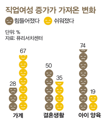 미국에서 ‘여성 가장’ 비율이 사상 최고치를 기록했다. 퓨리서치센터 조사 결과, 18살 이하 자녀를 둔 미국 가정의 약 40%는 여성이 생계비의 전부 또는 대부분을 벌고 있었다. 1960년(11%)의 3배 이상이다. 지난 50년간 배우자 없이 여성 혼자 아이를 키우는 경우(싱글맘)가 3.5배 늘었다. 남편보다 아내의 수입이 많은 경우도 4배가량 늘었다. 남편보다 많이 버는 아내의 증가율을 10년 단위로 보니, 2000~2010년에 가장 높았다. 이런 현실에서도 가정 내 성역할에 대한 고정관념은 쉬이 무너지지 않았다. 조사 대상자 4분의 3은 기혼 여성이 직장을 갖는 것이 아이 양육을 어렵게 하고 결혼생활에도 좋지 않다고 했다. 절반가량은 엄마가 어린 자녀와 함께 가정을 지키는 게 더 좋다고 답했다. 여성이 현실적으로 돈을 많이 벌어도 여전히 육아는 여성이 맡는 게 낫다는 이중성, 미국 얘기다.