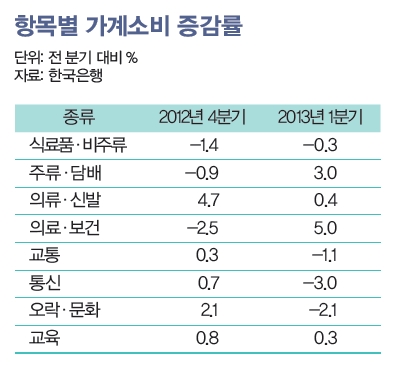가계가 허리띠를 한없이 졸라매고 있다. 한국은행이 6월7일 발표한 ‘2013년 1분기 국민소득(잠정)’을 보면 올 1분기 가계소비는 전 분기 대비 0.5%나 감소했다. 글로벌 금융위기 직후인 2009년 1분기(-0.5%) 이후 가장 낮은 수준이다. 그래도 지난해엔 가계소비가 분기마다 0.4~0.7%씩 꾸준히 증가했다. 그만큼 올해 들어 살림살이가 더 팍팍해졌다는 의미다. 가계의 소비 구조조정은 눈물겹다. 덜 먹고, 덜 입고, 덜 놀고, 덜 가르치고 있었다. 그 와중에도 소비가 늘어난 항목은 있다. 술을 더 마시고, 담배를 더 피우고, 병원에 더 갔다. 가계는 이 ‘죽음의 다이어트’를 언제쯤 끝낼 수 있을까.