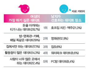 비극의 씨앗은 이런 식으로 잉태되나보다. 그래서 <화성에서 온 남자 금성에서 온 여자>라는 책 도 있지 않던가. 취업포털 ‘커리어’가 지난 7월11일 남성·여성 직장인 1200여 명을 대상으로 데 이트 설문조사를 했다. 조사에서 여성 응답자는 “유쾌하고 재치 있는 분위기 속에 극장에서 영 화를 보며 4만원 정도 쓰는 데이트”가 가장 이상적이라고 꼽았다고 한다. 그런데 ‘여성이 가장 하기 싫은 데이트’와 ‘남자가 선호하는 데이트 장소’ 설문조사 결과를 겹쳐보니 ‘대략 난감’하다. 더 난감한 건, 여성 응답자가 가장 선호하는 데이트 장소는 영화관, 도시락 나들이, 공연장 순이 었다는 사실. 아! 심오한 연애의 세계여.