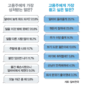 무서운 건 자존심보다 돈이었다. 아르바이트 전문 포털 사이트 ‘알바천국’이 구직자 2270명 을 대상으로 ‘고용주에게 가장 상처받는 말’을 조사한 결과 ‘알바비 늦게 줘도 되지?’(22.8%) 가 1위로 꼽혔다. ‘일을 이것밖에 못해?’(20.8%)나 ‘일할 다른 사람 많아’(18.2%)처럼 자존심을 박박 긁은 말들은 뒤로 밀렸다. 최저임금 언저리에 있는 쥐꼬리 알바비지만 청춘들에게는 등 록금이고 학원비며 생활비인 까닭이리라. 고용주에게 가장 듣고 싶은 말 역시 ‘알바비 올려줄 게’(35.1%)였다. ‘뭐든지 잘하네’(23.6%)나 ‘보기 드문 젊은이네’(13.6%)와 같이 기를 팍팍 살려 주는 칭찬은 그다음이었다. 이렇게 완전 소중한 알바비로 알바생 울리는 사장님, 나빠요~.