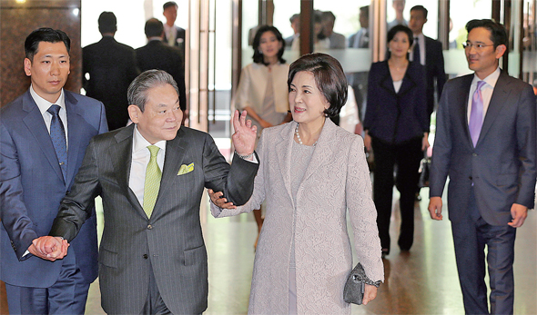 삼성의 변화는 차기 총수의 몫이 될 가능성이 높다. 이건희 삼성전자 회장(왼쪽 두 번째)이 지난 5월31일 오후 서울 중구 순화동 호암아트홀에서 열린 ‘2013년 호암상 시상식’에 홍라희 관장과 함께 참석하고 있다. 이 회장 부부 뒤로 이재용 삼성전자 부회장의 모습이 보인다.한겨레 김경호
