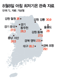 또다시 기록을 갈아치웠다. LA 다저스에 있는 류현진이 아닌, 요즘 날씨 얘기다. 특히 폭염에 ‘초열대야’라는 단어까지 등장한 8월8일은 폭염의 ‘역사적 순간’이기도 했다. 원래 우리 기상청에 열대야는 ‘전날 저녁 6시1분부터 다음날 오전 9시까지 최저기온이 25℃ 이상인 날’을 뜻하고, 최저기온 30℃가 넘는 ‘초열대야’라는 용어는 없었다고 한다. 그러나 8월8일 아침, 강원도 강릉시의 아침 최저기온이 30.9℃를 기록하면서 우리도 ‘초열대야’ 있는 나라가 됐다. 전국적으 로 관측 기록 최고치가 줄줄이 뒤바뀌었다. 경북 포항(29.1℃)·대구(28.2℃) 등 10곳에서는 가장 높았던 아침 최저기 온 기록이 경신됐고, 울산(38.6℃)·경북 울진(37.8℃)·울릉도(35.4℃)는 일일 최고기온의 최고치를 새로 썼다. 무더위 가 한동안 계속 이어진다던데… 아, 달갑지 않은 ‘최고’의 기록이여.