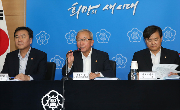 현오석 경제부총리(가운데)가 지난 8월28일 서울 세종로 정부청사에서 전·월세 시장 안정 방안을 발표하고 있다. 골자는 세금과 이자를 깎아줄 테니 빚내서 집을 사라는 얘기다. 왼쪽에 신제윤 금융위원장, 오른쪽에 서승환 국토교통부 장관이 앉아 있다.한겨레 이정아