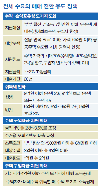정부는 또 국민주택기금에서 지원하는 주택 구입자금 대출의 자격 요건은 완화하고 대출 한도는 크게 늘렸다. 지금까지는 부부 합산 연소득이 4500만원 이하인 무주택 가구가 3억원 이하의 주택을 살 때 1억원까지만 연 4%의 이자로 빌려줬지만, 앞으로는 소득은 6천만원 이하, 집값은 6억원 이하, 최대 대출액은 2억원으로 대상을 넓혔다. 금리도 소득이나 만기별로 2.8~3.6%로 낮췄다. 지난 4·1 부동산 대책 때도 대출받을 수 있는 최저소득 기준을 높이고 금리를 내렸는데 이번에 또다시 손을 본 것이다.
