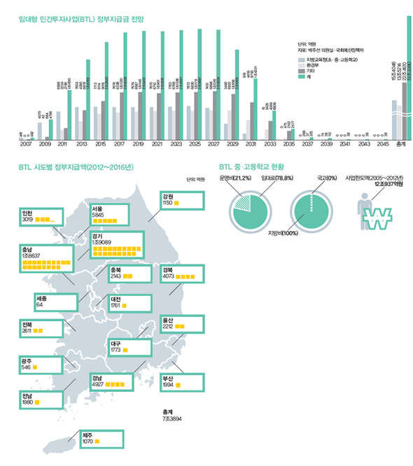 경기도교육청은 초·중·고교 임대료로 지난해 2740억원을 냈고 올해는 2975억원을 내야 한다. 이러한 오름세는 13년 뒤인 2026년에야 꺾인다. 경기도교육청 관계자의 말이다. “신도시 학교 시설이 많이 필요했는데 교육부가 BTL 사업을 권장했다. 하지만 이제 정책이 바뀌었다. 직접 재정을 투입하거나 공영택지개발지구의 신설 학교는 개발사업자가 무상 공급한다.” 하지만 이미 경기도교육청의 재정은 최악의 수준이 됐다. 2012년 말 기준으로 지방채 잔액이 6조원을 넘겼다. 경기도교육비특별회계 세입(11조원)의 절반을 웃돈다. 서울시교육청도 만만치 않다. 2005~2009년에 추진한 BTL 사업으로 민간투자 9384억원을 이끌어냈지만 20년간 2조4467억원(임대료 1조8497억원, 운영비 5970억원)을 뱉어내야 한다. 공정택 전 교육감이 2008년 재선을 앞두고 마구잡이로 끌어들인 민자 투자의 후폭풍이다. 박주선 의원은 “민간투자사업은 초기 건설비 부담은 적지만 중·장기적으로 정부의 부담을 오히려 증대한다. 사회공공성을 다루는 학교 등 사회기반시설의 건설과 운영은 민간이 아닌 국가와 지자체가 책임지는 게 맞다”고 말했다.
