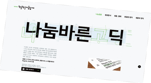2012년 한 해 잠시 숨을 고른 네이버는 올해 다시 ‘나눔바른고딕’으로 한글날을 맞았다. 기존 나눔고딕의 모서리를 벼려 정통 고딕에 가깝게 디자인한 글꼴이다. 스마트폰 환경에 맞춰 모바일 화면에서도 또렷이 보이도록 디자인한 게 특징이다.