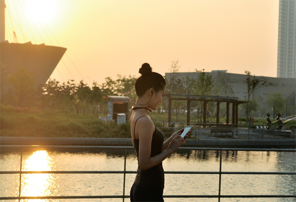실내 자전거의 페달을 밟았다. 앱 화면에 표시된 심박수(bmp)가 서서히 올라갔다. 100bpm을 넘어서니 이어폰에서 “지방연소 영역에 진입했다”는 안내가 나왔다. 근육을 적당히 쓰면서 오래 운동하기에 안성맞춤이라는 구간이다. 더 낮은 운동 강도를 원하면 워밍업(최대 심박수 50~60%), 더 높은 강도를 원하면 심폐지구력 강화(70~80%), 근지구력 향상(80~90%), 전문 운동선수 영역(90~100%) 구간도 선택할 수 있다. 해당 영역에 들어설 때마다 안내가 나오는 덕에 혼자 운동해도 얼마든지 페이스 조절이 가능했다. 이어폰의 이어버드에 장착된 센서가 귀의 피부 속에 있는 맥박을 통해 실시간으로 심박수를 측정하는 덕분이다. 10분 정도 지났을까. 막장으로 치닫는 드라마에 정신을 빼앗겨 페달 밟는 속도가 느려지니, “워밍업 영역에 진입했다”는 안내가 나왔다. 심박수가 목표보다 떨어졌으니 열심히 달리라는 일종의 경고였다. 정신이 번쩍 들었다. 다시 일정한 속도로 페달을 밟았다. 실내 자전거의 디스플레이가 고장난 터라 중간에 스마트폰 앱을 보며 심박수·거리·시간 등도 체크했다. 아이리버의 독려로 목표 시간인 50분을 꽉 채우고 자전거에서 내려왔다. 다리는 바들바들 떨리고, 땀은 줄줄 흘렀다. 운동 효과를 확인하려고 앱을 열었다. 그러나 기대와 달리 운동 거리, 이동 속도와 같은 정보는 제공되지 않았다. 이는 스마트폰의 위치추적장치(GPS)와 가속도 센서를 통해 계산되는데, 실내 자전거라 두 장치가 작동하지 않은 탓이다. 운동한 거리에 성별·키·몸무게를 반영해 산출되는 소모 칼로리 역시 알 수 없어 실망스러웠다. 어쨌든 이날 운동한 거리와 시간 등 정보는 앱의 달력에 차곡차곡 기록됐다. 이를 소셜네트워크서비스(SNS)를 통해 가족이나 친구들과 공유할 수도 있다. 지치지 않고 꾸준히 운동할 수 있게 도와주는 장치인 셈이다. 이틀 뒤 두 번째 사용했다. 이번엔 텔레비전을 끄고 블루투스 기능을 활용해봤다. 최근 출시된 자우림의 9집 앨범 <굿바이, 그리프>(Goodbye, grief)를 들으며 힘차게 페달을 밟았다. 목밴드 왼쪽에 있는 버튼으로 손쉽게 재생, 멈춤, 전곡, 다음 곡 선택이 가능했다. 때마침 전화도 울렸다. 통화 관련 기능은 목밴드 오른쪽에 있었다. 전화를 받거나 끄고, 음량도 조절할 수 있었다. 다만 상대방이 “목소리가 멀게 느껴진다”고 했다. 목밴드가 목에 밀착되지 않아 마이크 단자의 위치가 자꾸만 움직이기 때문인 듯했다. 또 다른 아쉬움도 있었다. 센서가 달려 있어서인지 이어버드가 일반 블루투스나 휴대전화 이어폰보다 단단하게 느껴졌다. 또 이어버드는 체형에 맞게 세 개의 크기 가운데 선택할 수 있는데, 가장 작은 이어버드를 착용해봐도 여전히 커서 운동 중 빠지곤 했다. 야외에서 운동할 땐 이런 단점이 좀더 크게 다가왔다. 공원에서 3km 거리를 자전거로 달려봤다. 실내에서 자전거를 탈 때보다 몸을 더 움직이게 되니 이어폰이 더 자주 빠지거나 귀 안에서 겉돌았다. 센서가 있는 이어버드가 귀에 밀착되지 않으면 심박수가 제대로 측정이 안 된다며 경고음이 울리는데, 신경이 쓰였다. 계속 이어폰을 꽂고 있어야 하는 터라 주변 소리가 잘 안 들려 돌발 상황에 빠르게 대처할 수 없는 것도 부담이었다. 그래도 야외에서 자전거를 타면 이동 거리, 속도, 소모 칼로리 등이 곧바로 계산되는 점은 좋았다. 끊임없이 제공되는 데이터와 경고음 아이리버온을 이리저리 뜯어본 결론은 이렇다. 건강 관리에 특화된 최신 ‘웨어러블 디바이스’(인체에 착용 가능한 기기)가 생겼다는 사실만으로도 당장 뛰고 싶어졌다. 운동에 실시간으로 반응하는 신체정보를 확인하면서 내 몸에 대한 이해도도 높아졌다. 그러나 끊임없이 제공되는 데이터와 경고음 때문에 운동이 주는 자유로움과 즐거움이 반감되는 듯한 아쉬움은 남았다. 서보미 기자 spring@hani.co.kr·김성환 기자 hwany@hani.co.kr
