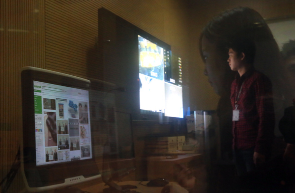 경기도 성남시 분당구 네이버 본사 20층에 있는 ‘아이트래킹’ 실험실. ‘비밀의 거울’을 사이에 두고 실험실과 모니터실이 붙어 있다. ‘아이트래커’ 앞에서 실험하는 연구원(여자)의 모습이 유리 너머로 보이고, CCTV 화면을 통해 옆방 실험실을 실시간으로 지켜보는 다른 연구원(남자)의 모습이 유리에 비쳤다.