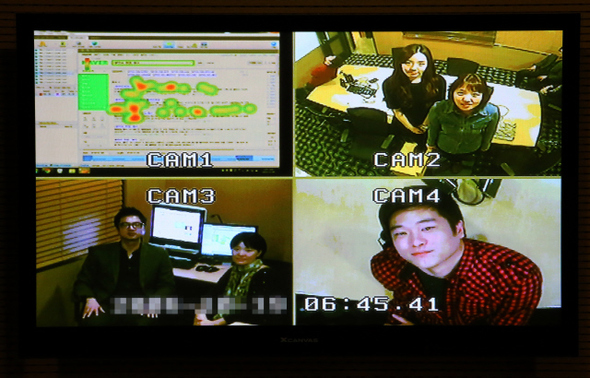 네이버 UX실 연구원들이 ‘아이트래킹’ 실험실에 설치된 CCTV 앞에서 저마다 자세를 취했다. 실험실 바로 옆방 모니터에 실시간으로 나오는 이들의 모습을 다시 카메라로 찍었다.