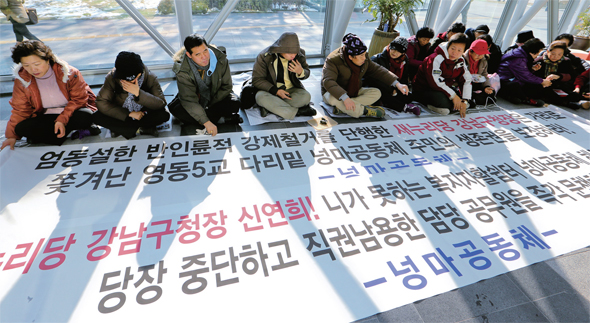 동양피해자대책협의회 회원들이 지난 11월21일 오후 서울 성북동 현재현 동양그룹 회장 자택 앞에서 동양 기업어음·회사채 투자자 피해 보상을 요구하는 집회를 열고 요구사항을 적은 종이를 벽에 붙이고 있다.한겨레 류우종