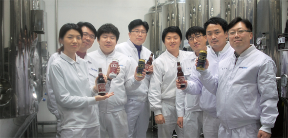 ‘퀸즈에일’은 하이트진로 맥주연구원 60명이 3년간 개발에 매달려 2013년 9월에 선보였다. 시음 테스트가 250회가 넘어 연구원이 마신 맥주만 12t에 이른다. 강원도 홍천공장에서 연구원들이 퀸즈에일을 들고 기념촬영을 하고 있다.하이트진로 제공