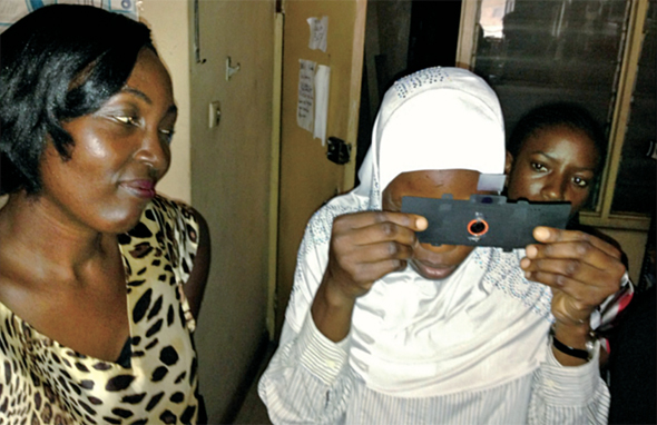 1달러도 안 들여 만들 수 있는 현미경 ‘폴드스코프’를 들여다보고 있는 모습. 폴드스코프 제공