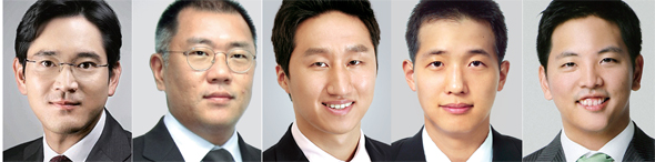 재벌그룹을 이어받을 3세 경영인들. 이재용 삼성전자 부회장, 정의선 현대자동차그룹 부회장, 정기선 현대중공업경영기획팀 수석부장. 김동관 한화큐셀 마케팅실장, 박세창 금호타이어 부사장(왼쪽부터). 한겨레 자료