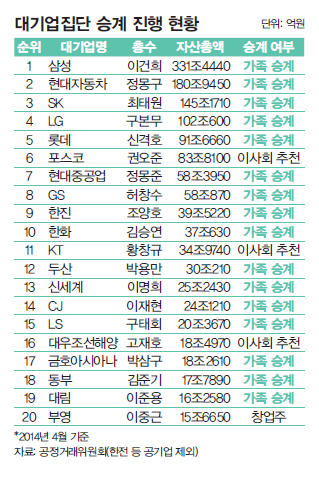 대표적인 주자로는 삼성그룹의 이재용 부회장 남매를 비롯해 현대자동차그룹의 정의선 부회장이 있다. 정의선 부회장의 사촌동생인 현대중공업그룹의 정기선씨는 지난해 수석부장으로 회사에 들어왔다. 한화그룹도 김승연 회장이 감옥에 다녀온 뒤 아들 김동관 한화큐셀 마케팅실장의 이름이 부쩍 언론에 많이 등장하고 있다. 10대 그룹 가운데 재벌이 아닌 포스코를 제외한 9곳 대부분에서 3세의 역할이 커지고 있는 상태다. 반면 외국 대기업에선 자식에게 경영권을 물려주는 게 일반적이지 않다. 미국 경제지 <포천>이 올해 선정한 ‘세계의 존경받는 기업’ 10곳을 보면 가족 승계 기업을 찾기 힘들다. 구글과 아마존 등 창업한 지 얼마 안 된 정보기술(IT) 기업을 뺀 애플, 코카콜라, 월트디즈니, 페덱스, 제너럴일렉트릭(GE) 등 나머지 기업은 후계자를 가족 위주로 결정하지 않는다.