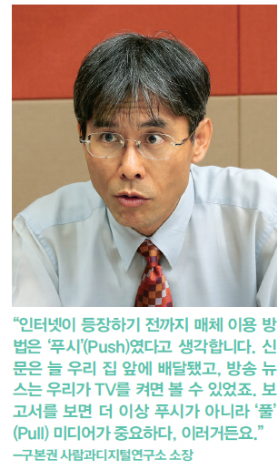 사회- 인터넷이 등장하기 전까지 매체 이용 방법은 ‘푸시’(Push)였다고 생각합니다. 신문은 늘 우리 집 앞에 배달됐고, 방송 뉴스는 우리가 TV를 켜면 볼 수 있었죠. 보고서를 보면 더 이상 푸시가 아니라 ‘풀’(Pull) 미디어가 중요하다, 이러거든요.