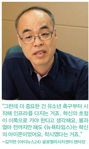 김- 한국 온라인 저널리즘을 가로막는 것 중 하나는 스노폴이란 얘기를 많이 했어요. 미디어 혁신을 얘기하는 사람들이 스노폴 얘기를 너무 많이 해요. 우리나라가 유소년 축구를 깡그리 무시하고 월드컵 4강에 올라갔어요. 중요한 성과죠. 스노폴도 마찬가지예요. 그런데 더 중요한 건 유소년 축구부터 시작해 인프라를 다지는 거죠. 혁신의 초점이 이쪽으로 가야 한다고 생각해요. 불과 얼마 전까지만 해도 <뉴욕타임스>는 혁신의 아이콘이었어요. 착시였다는 거죠.