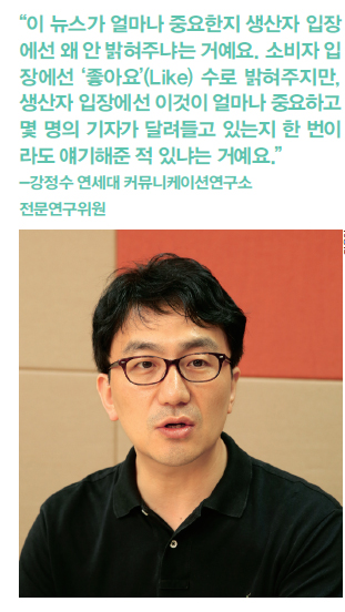 강- 이 뉴스가 얼마나 중요한지 생산자 입장에선 왜 안 밝혀주냐는 거예요. 소비자 입장에선 ‘좋아요’(Like) 수로 밝혀주지만, 생산자 입장에선 이것이 얼마나 중요하고 몇 명의 기자가 달려들고 있는지 한 번이라도 얘기해준 적 있냐는 거예요. 팀 풀이라는 기자가 있어요. 기사를 쓸 때 매번 페이스북 그룹을 만들어요. 관심 있는 사람은 공개 그룹으로 들어오라고. 기사 주제도 얘기해주고 취재 과정부터 사진으로 남겨요. 내가 오늘 누구를 인터뷰할 건데 뭘 물어볼까 올리고, 인터뷰가 끝나면 바로 또 글을 올리죠. 이제 생산자는 소비자에게 이 뉴스가 생산자 입장에서 얼마나 중요한지 전달하는 새로운 문법을 찾아야 합니다.