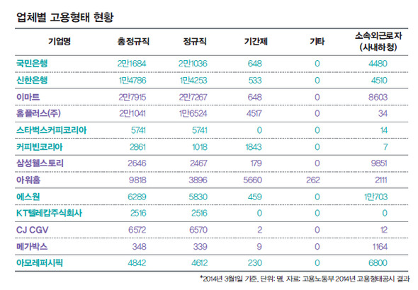 유통업계에서는 이마트가 전체 직원의 약 31% 수준인 8603명을 소속외근로자로 채용하고 있다고 밝혔으며, 홈플러스는 전체 직원의 21%(4517명)가 기간제 노동자였다. 롯데백화점·롯데마트·롯데슈퍼가 함께 있는 롯데쇼핑은 전체 직원 3만1778명 가운데 정규직 2만4548명, 기간제 7230명, 그리고 사내하청 노동자가 1만1114명이었다. 국내 1위의 화장품 업체인 아모레퍼시픽도 소속외근로자(6800명)가 정규직(4612명)의 1.5배를 차지했다. 아모레퍼시픽 관계자는 “도급 관계인 소속외근로자 대부분이 아리따움 등 매장에서 판매 업무를 하거나 공장에서 생산 업무를 맡고 있다”고 설명했다.