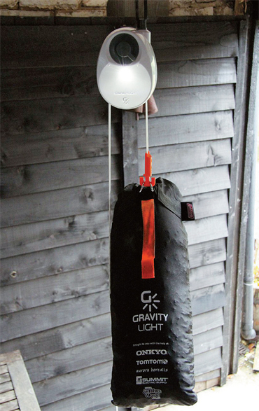 그래비티라이트는 사람 손을 빌려 전기를 만든다. 준비 과정은 간단하다. 먼저 본체와 함께 제공되는 천가방 안에 묵직한 물건을 채워넣어야 한다. 돌멩이든 모래든 물이든 상관없다. 무게는 10kg 정도로 맞춰준다.