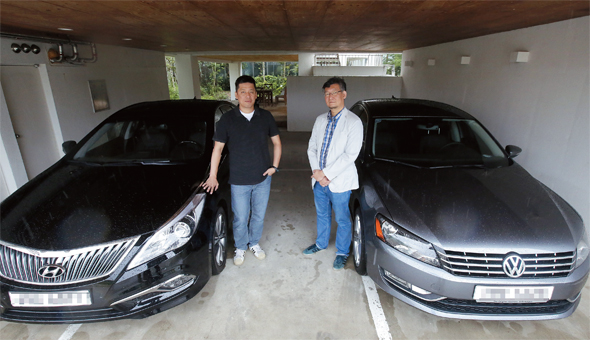 이다일 〈세계닷컴〉 기자와 류청희 자동차 칼럼니스트가 8월22일 경기도 파주 헤이리 마을에서 현대 그랜저 디젤과 폴크스바겐 파사트 앞에 섰다. 이날 쏟아지는 비를 피해 한 카페 주차장에서 사진을 촬영했다. 한겨레21 정용일 기자 yongil@hani.co.kr