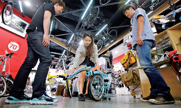 김경동 바이클로 반포점장과 이정연 〈한겨레21〉 기획편집팀 기자, 임성수 〈자전거생활〉 편집장(왼쪽부터)이 지난 9월11일 오후 서울 잠원동 바이클로 반포점에서 접이식 자전거를 살펴보고 있다. 한겨레21 정용일 기자 yongil@hani.co.kr