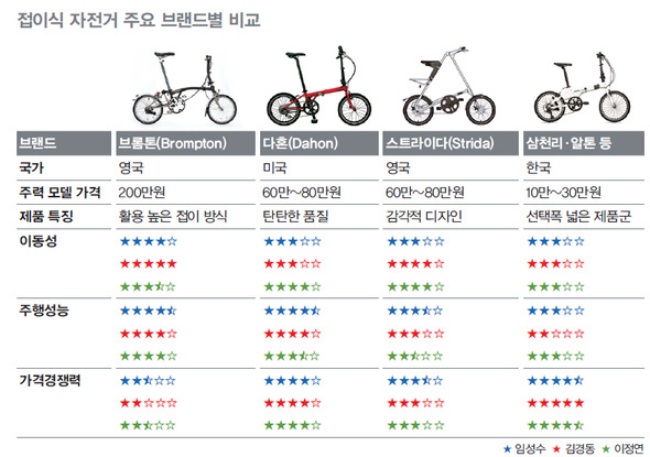 이: 국내외 접이식 자전거 브랜드가 많다. 브롬톤·다혼·스트라이다·삼천리·알톤 등 다양하다.
