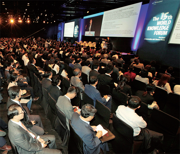 지난 9월19일 서울신라호텔에서 ‘세계지식포럼’ 사전행사로 열린 ‘토마 피케티와의 대화’에서 참석자들이 피케티 교수와 패널들 사이에 벌어진 토론을 듣고 있다. 이날 행사의 패널은 모두 남성이었다. 매일경제 제공