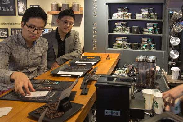 심재범(이하 심): 매장의 기본기를 보려면 브라질을 마셔봐야 한다. (한 모금 마신 뒤) 스타벅스는 기본적으로 강배전(강하게 오래 볶은 것) 원두를 쓴다. 그럴수록 커피맛이 써져서 우유, 시럽 등을 넣게 되니까 단가가 올라간다.