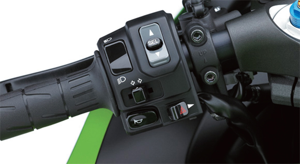 오토바이의 핸들 왼쪽 스위치 뭉치 모습. 최근 나오는 대배기량 모터사이클에는 이 부분에 ‘모드 셀렉트’ 기능이 추가돼 있다. 가와사키 홈페이지 화면 갈무리
