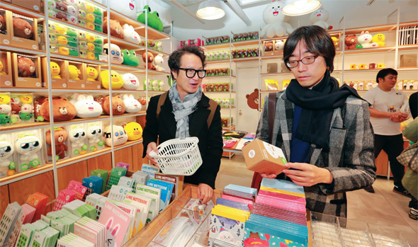 만화가 김태권(오른쪽)씨와 모바일 앱 개발회사에 다니는 이승규씨가 지난 11월12일 서울 을지로 롯데영플라자 1층에 있는 라인프렌즈 팝업스토어를 둘러보고 있다. 류우종 기자