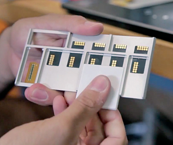 시제품 사진을 보면 구조가 놀랍도록 간단하다. 본체 뒷면 위·아래로 프로세서(두뇌)나 배터리(심장) 부분을 교체하면 된다. 각 구성요소를 하나하나 조립하는 구글 ‘아라’보다 훨씬 단순하다.
