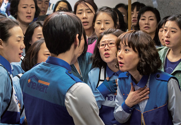 영화 〈카트〉에서 기업은 제대로 대접받지 못했다고 항의하는 고객을 달래기 위해 대형마트 서비스 노동자에게 무릎을 꿇게 한다. 영화인 제공