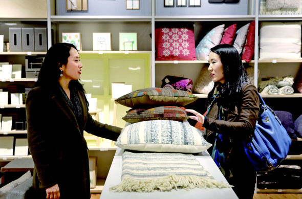 인테리어 전문 월간지에서 디자인 전문 기자로 일하는 유승주씨(왼쪽)와 ‘트렌드큐레이터’ 김은영씨가 서울 강남구 삼성동 코엑스몰에 입점한 '자주'(JAJU) 매장에서 이야기를 나누고 있다.