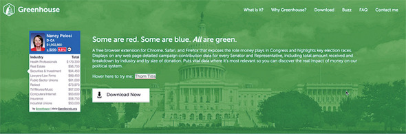 그린하우스는 웹브라우저에 붙여 쓰는 확장기능이다. 흔히 말하는 ‘플러그인’이라고 보면 된다. 애플 ‘사파리’와 구글 ‘크롬’, 모질라 ‘파이어폭스’에서 쓸 수 있다. 설치도, 이용 방법도 쉽다. 웹브라우저 장터에서 확장기능을 찾아 ‘설치’만 누르면 준비는 끝난다. 이제 미국 상·하원 의원들 이름이 포함된 웹사이트를 방문하면, 자동으로 의원 이름을 인식해 도드라지게 표시해준다. 그 위에 마우스 커서를 살포시 갖다대보자. 꼬마 팝업창이 뜨면서 해당 의원이 캠페인으로 모금한 자금 내역을 일목요연하게 보여준다.