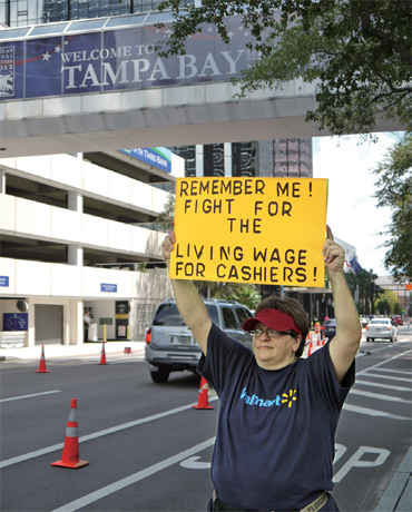 2012년 8월 월마트 매장 계산원인 폴라 조던이 공화당 전당대회가 열리는 곳 앞에 서서 “생활임금을 벌기 위해 분투하고 있다는 걸 기억하라”고 적힌 손팻말을 들고 시위하는 모습. 한겨레 박현 기자