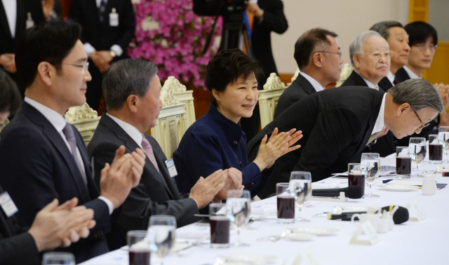 이재용 삼성전자 부회장, 구본무 LG그룹 회장, 정의선 현대자동차그룹 부회장 등이 지난 2월24일 청와대를 찾아 박근혜 대통령과 문화체육 활성화 방안에 대해 이야기를 나누고 있다. 청와대사진기자단