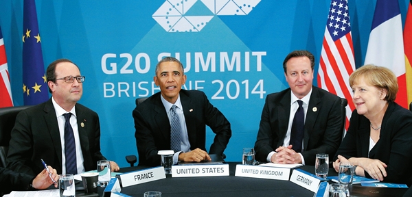 2014년 11월 오스트레일리아 브리즈번에서 열린 G20 정상회의에 모인 프랑수아 올랑드 프랑스 대통령, 버락 오바마 미국 대통령, 데이비드 캐머런 영국 총리, 앙겔라 메르켈 독일 총리(왼쪽부터). REUTERS